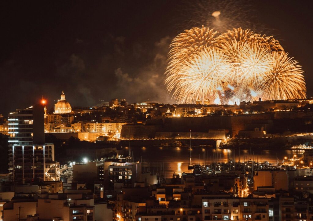 Public countdown and fireworks in Valletta, centred around St George’s Square, alongside parallel celebrations in Victoria, Gozo, with live music and firework displays.