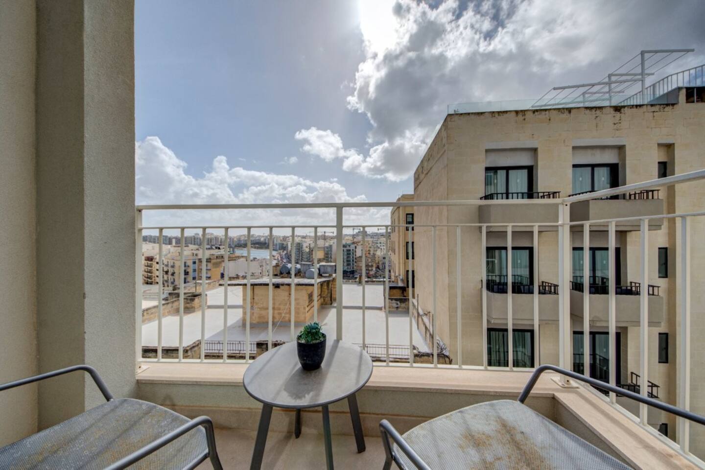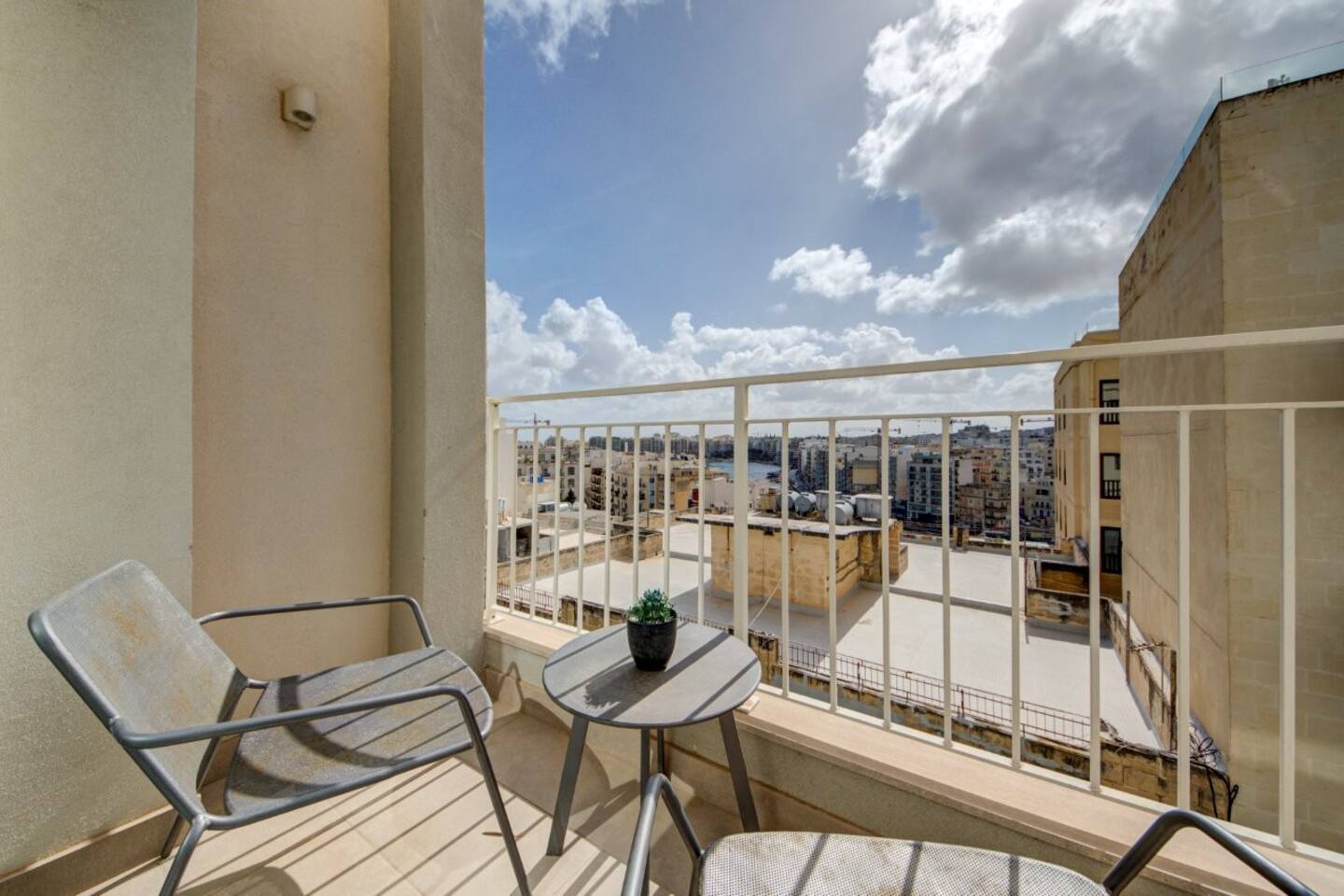 🏑 Front Balcony – outdoor seating with distant sea views over Spinola Bay