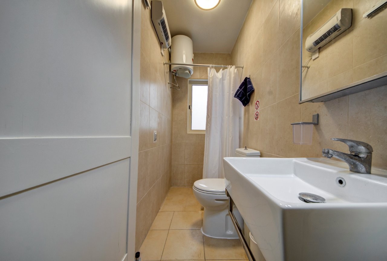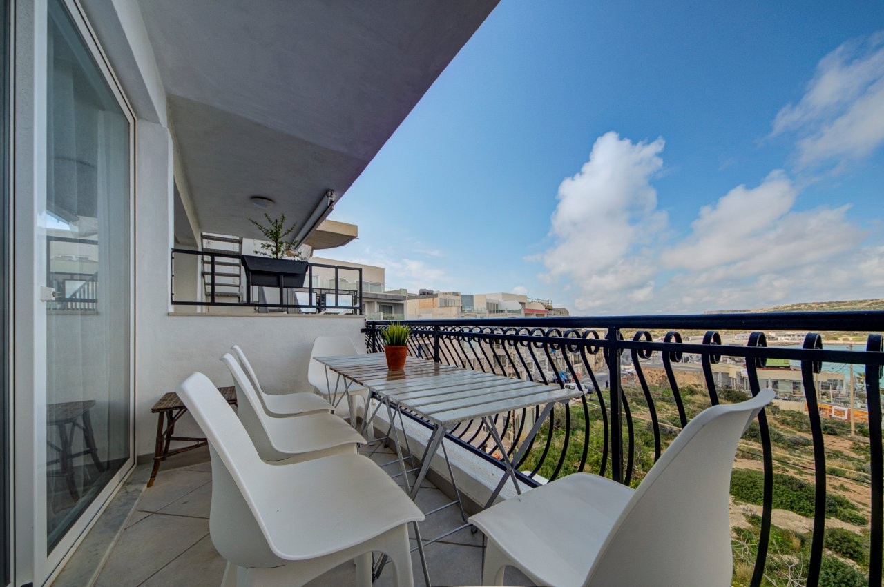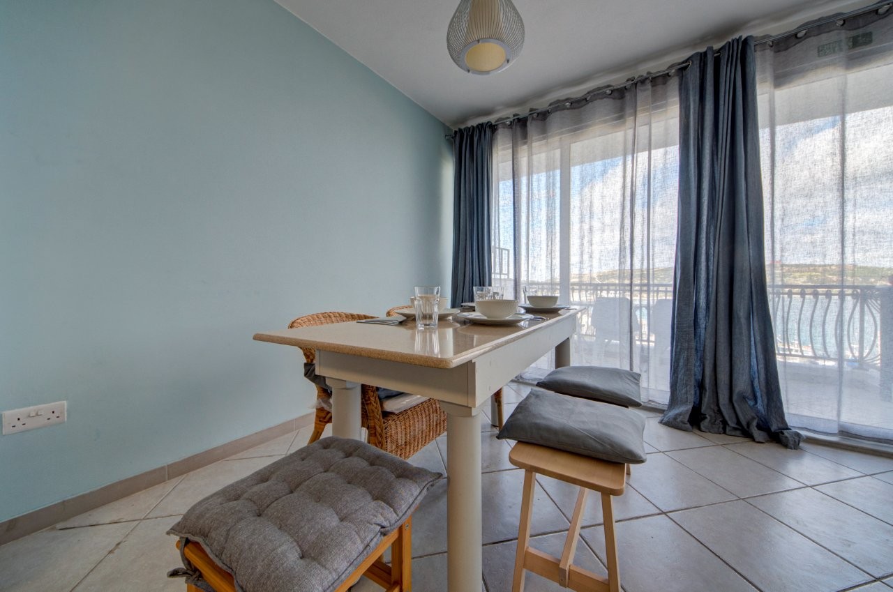 Seafront apartment on the 3rd floor in Mellieħa, directly facing Għadira Bay — Malta’s largest sandy beach. Three bedrooms, two bathrooms, and open sea views from the building, with a rocky swim spot one minute’s walk away and everything else — restaurants, water sports, coffee shops — on the doorstep. A practical, well-located base for up to 5 guests.
