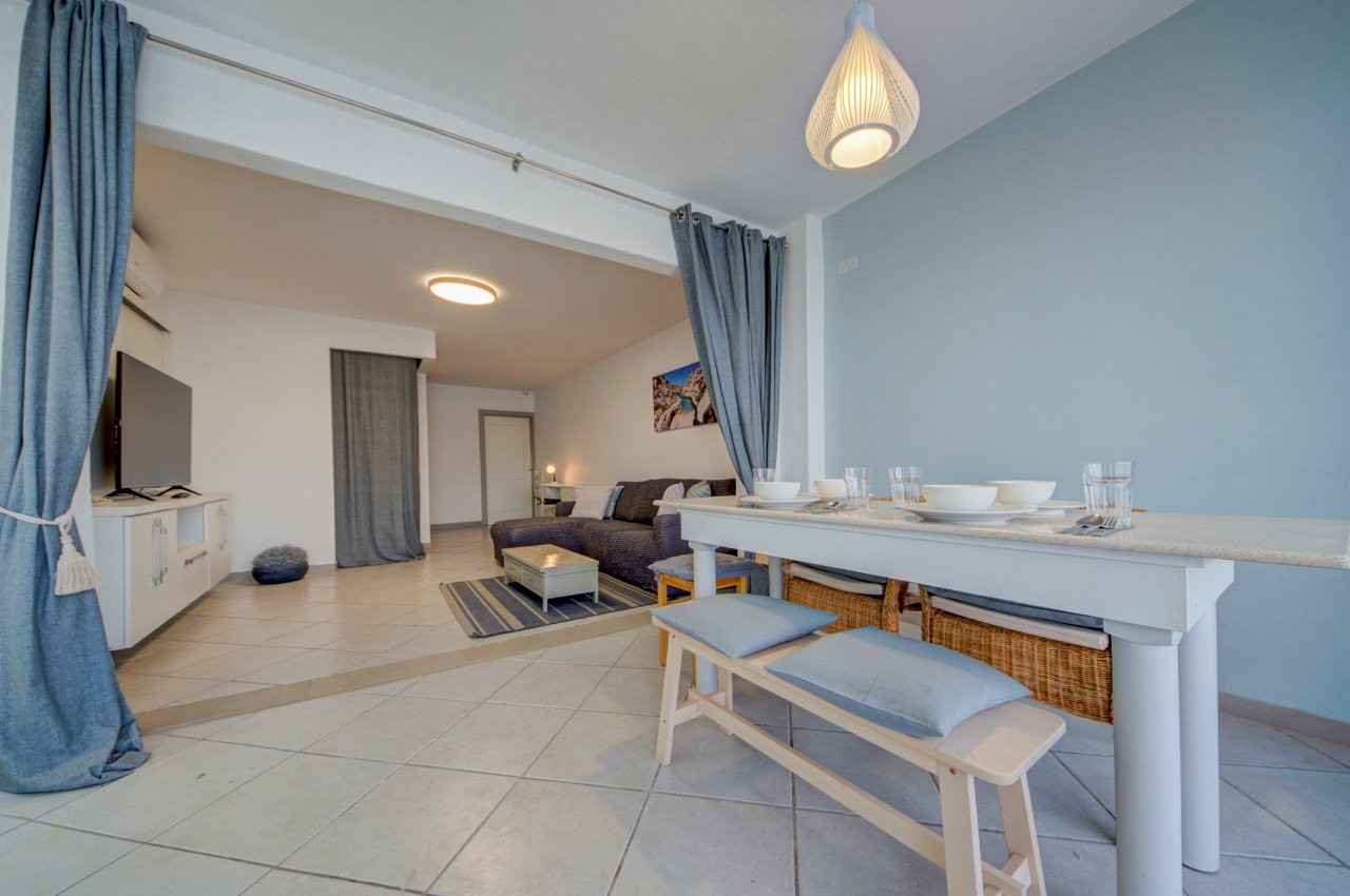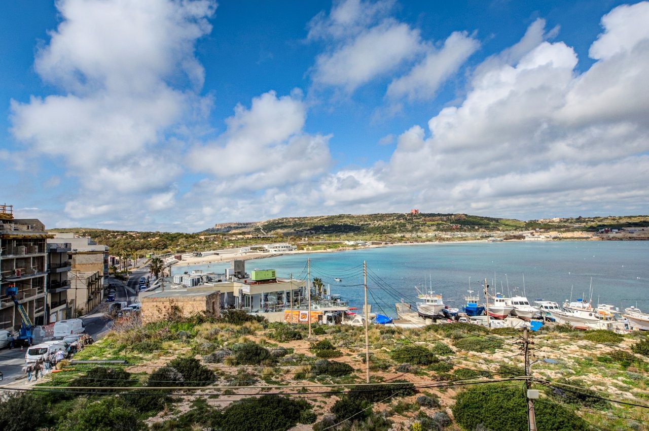 Għadira Bay stretches for several hundred metres of golden sand, with calm, shallow water that makes it one of the safest swimming beaches on the island. Sun lounger and parasol hire is available directly on the beach in season. A rocky swimming spot sits just a one-minute walk from the building for those who prefer quieter, uncrowded water entry.